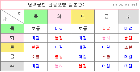 납음오행에 따른 궁합법을 말합니다. 생년의 간지를 오행으로 분류하여 남녀간의 궁합을 따져본 것입니다. 오행간에 상생이면 길, 비화이면 평. 극관계는 흉인 경우가 많습니다. 참고로, 납음오행의 경우 자평명리학의 오행과 다소 차이가 있습니다.