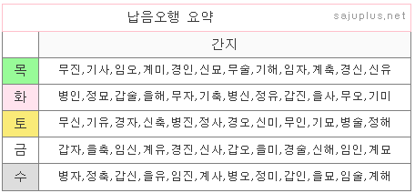 생년의 간지에 따른 오행 분류표입니다. 예컨데, 음력 출생년도의 간지가 무진년이면 목오행, 병인년이면 화오행, 무신년이면 토오행이 됩니다.