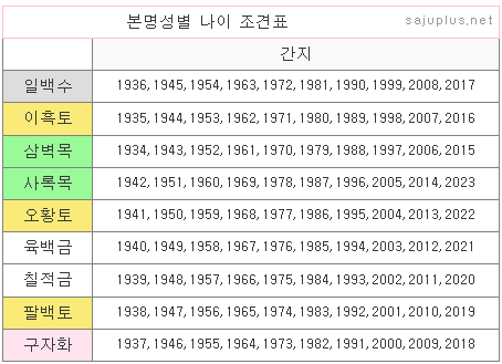 나이에 따른 본명성 조견표입니다. 태어난 해가 1936년생, 1945년생, 1954년생이면 본명성이 일백수성인이 되고, 1941년생, 1950년생, 1959년 생이면 오황토성인이 됩니다.