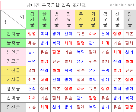 위 조견표에서 생기, 복덕, 천의는 좋은 궁합에 속하고, 유혼, 귀혼, 절체는 보통의 궁합, 마지막으로 절명이나 화해는 나쁜 궁합에 속합니다.
